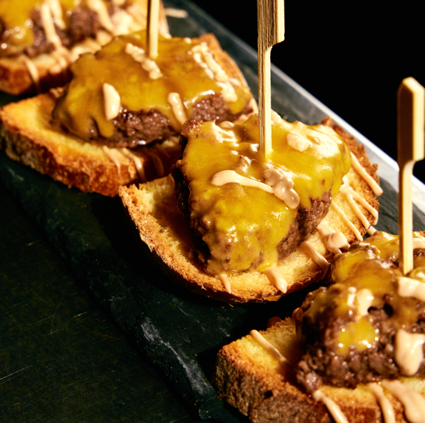 Quattro bocconcini di scottona piemontese su pane tostato, cheddar, emulsione di senape
