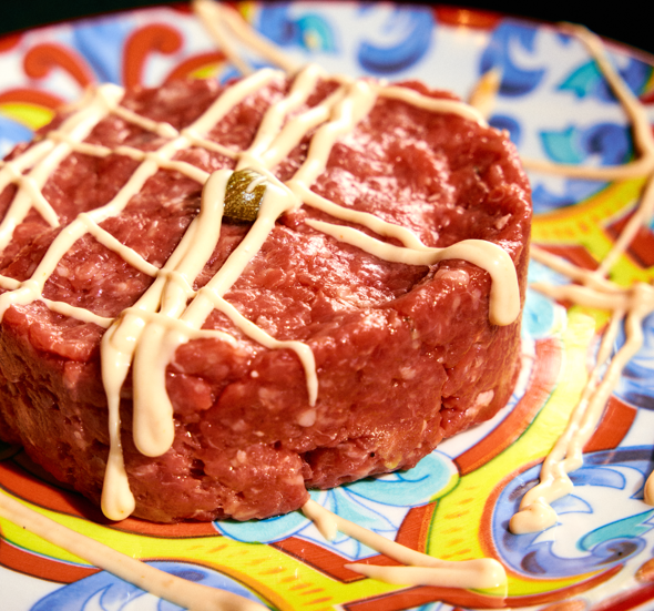 160 g di battuta di scottona piemontese, cipolla, senape, limone, Tabasco, salsa Worcestershire